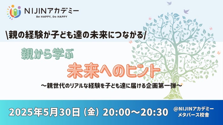 株式会社NIJIN(本社:東京都江東区、代表取締役:星野達郎)は、親世代のリアルな声を子ども達に届ける企画の第一弾として、2025年5月30日(金)にオンラインイベント、「未来への一歩シリーズ~親から学ぶ未来へのヒント~」を開催します。