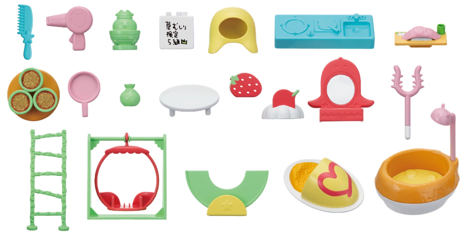 ・同梱内容: 本体(プリンハウス)、ちいかわ人形、ハチワレ人形、うさぎ人形、チャリメラ、お寿司、参考書、虫、オムライスのベッド、パイシチューのお風呂、ツタのはしご、さすまた、報酬、タコウインナーのドレッサー、くし、ドライヤー、スライスチーズの服、勉強テーブル、キッチン、フライパン、虹の橋、イチゴの椅子、メロンのシーソー、クリームとチェリーの椅子、イチゴのブランコ