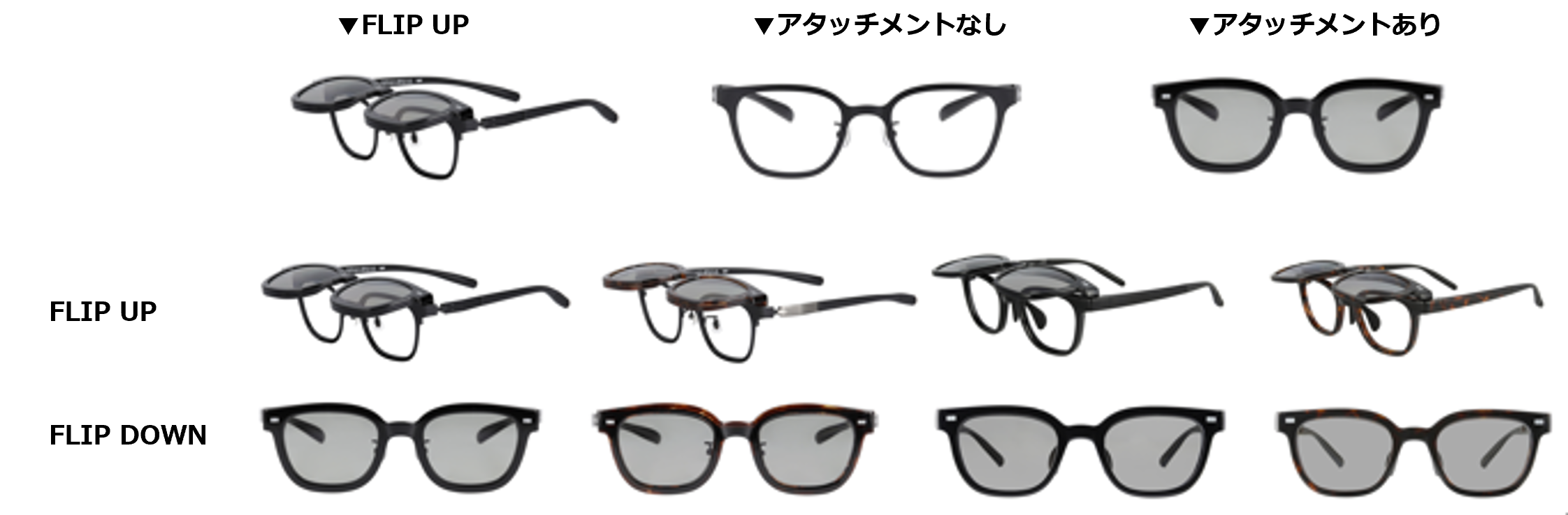 ZY222G04_14F1(ブラック/アタッチメント_グレーの偏光調光レンズ)、ZY222G04_14F2(ブラック/アタッチメント_グレーの偏光調光レンズ)、ZO221G01_14E1(ブラック/アタッチメント_グレーの偏光調光レンズ)、ZO221G01_49A1(べっこう柄/アタッチメント_グレーの偏光調光レンズ)、