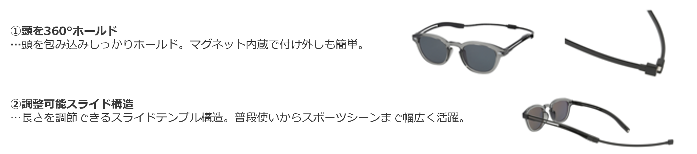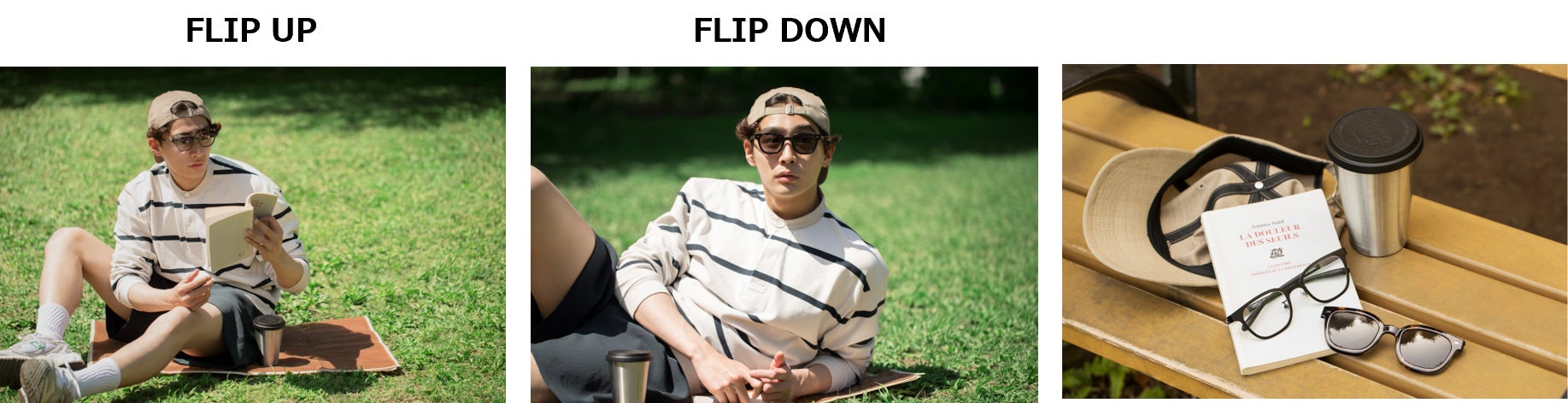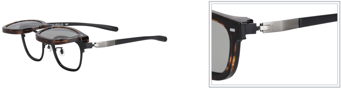 フロントアタッチメントを着けると偏光調光機能付きサングラスに、外すと普通のメガネになる、手軽で高機能な2WAYタイプ。アタッチメントは跳ね上げることもでき、マグネットで簡単に上げ下げ可能。使い勝手の良さを実現しました。