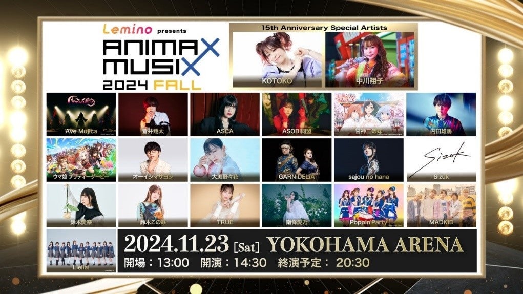「ANIMAX MUSIX」は「アニメミュージックの魅力を世界へ」をコンセプトに、2009年からスタートしたアニメミュージックイベントです。15周年を迎えた今年の春に開催した「Lemino presents ANIMAX MUSIX 2024 SPRING」につづき、2回目の共催となる「Lemino presents ANIMAX MUSIX 2024 FALL」は、横浜アリーナで開催いたします。