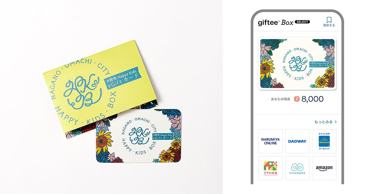 「大町市 Happy Kids eGift」は、デジタルギフトを活用した法人および自治体向けサービス「giftee for Business」の主力プロダクト「giftee Box®」(※4)を大町市仕様にカスタマイズしたカードタイプのデジタルギフトボックスです。カードに印字された二次元コードをスマートフォンなどで読み込み、所定のアンケートに回答することで、即時にデジタルギフトと交換できる「ギフトポイント」を受け取ることができます。デジタルギフトは、ナルミヤ・インターナショナル、DADWAY、ボーネルンドなどの育児関連ブランドや、nicomama、ママの休食など育児をされるお母さんをサポートするサービス、手軽で身体に優しい宅食のギフトチケット、Amazon(※5)で利用できるものなど、子育て用品のみならず、子育て中のご家庭でもお使いいただきやすい110種類以上(※6)のラインナップを取り揃えています。実店舗での利用のほかECでも利用できる幅広いデジタルギフトのラインナップにより、各ご家庭のニーズに合わせた活用をしていただけます。金額(保有する「ギフトポイント」)内で複数のギフトを組み合わせて受け取ることも可能です。