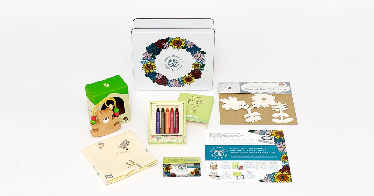 このたびギフティが企画・提供した「Happy Kids Box」は、育児に活用できる実用的なモノのギフト、おもちゃ2種類、クレヨン、スタイの4点と、デジタルギフトボックス「大町市 Happy Kids eGiftカード」(カードタイプ)の計5点をオリジナルのギフト缶に詰め合わせた大町市オリジナル仕様のギフトボックスです(1人当たり2万円分)。家族や大町市という地域との”つながり”をコンセプトに、保育所等を利用せずご自宅でお子さんを養育されているご家庭が、前向きな気持ちで子育てを楽しんでいただけるように、また、子育て中の保護者の方にもご利用いただけるようなギフトラインナップを取り揃えております。なお、モノのギフトは、親子のコミュニケーションをはぐくみながら、長く寄り添えるように、感受性豊かなお子さんの五感を刺激するおもちゃや、大きくなってからもお使いいただけるプロダクトをセレクトしております。ギフトは、オリジナルで制作したギフト缶に詰め合わせて贈呈する仕様であり、お子さんの成長とともに形として思い出の品を入れておける特別なボックスとしてお使いいただけるように、スチール缶を採用しております。缶の蓋のデザインには大町市の多機能型障害福祉サービス事業所である「すずらん」で就労される方が描いたイラストを採用し、自然豊かな大町の地で、家族や地域が優しい円(縁)でつながり、お花やくだものがすくすくと育つように成長を感じられるイメージをデザイン化して施しています。