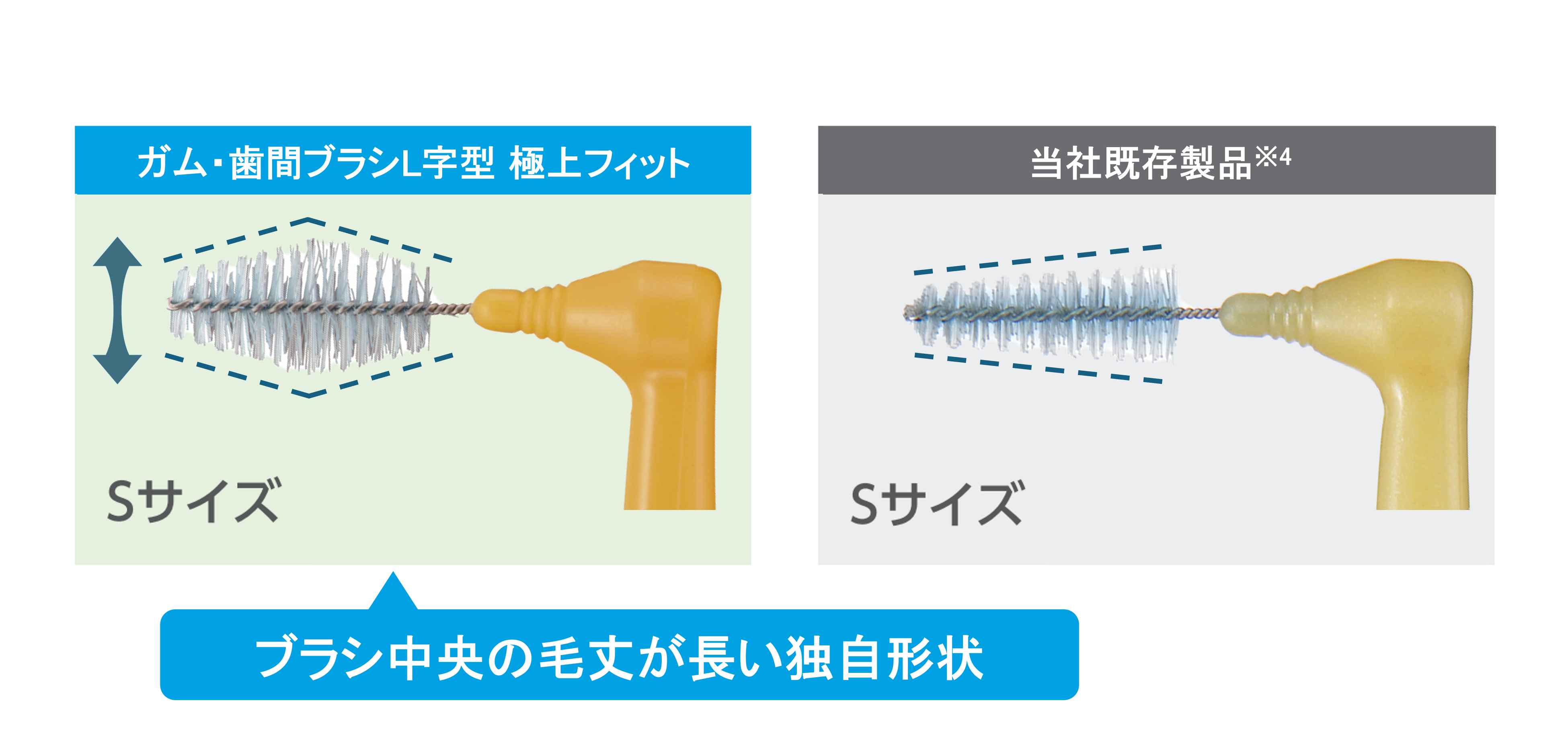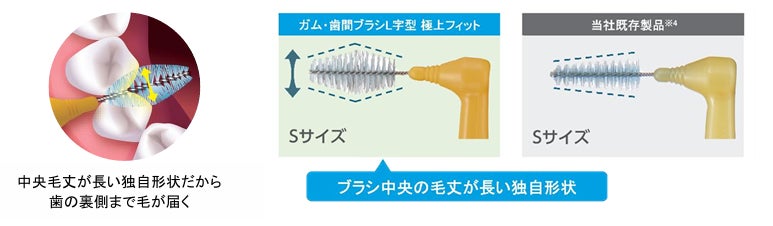このようなニーズに応えるべく、「ガム・歯間ブラシL字型 極上フィット」を発売します。本製品の最大の特長は、同一サイズの当社既存製品※4と比較し、ブラシ中央の毛丈が1.5倍長い独自形状です。この形状により、歯周プラークが残りやすい広い歯間部や歯の裏側まで毛が密着して、歯周プラークを効率的にかき出します。みがき残しが起こりやすいインプラントやブリッジ周辺のケアにもおすすめです。