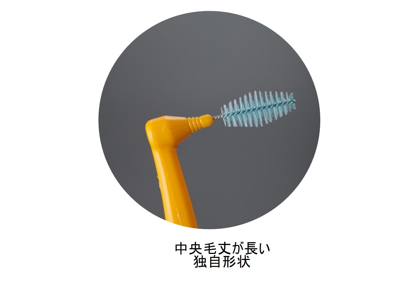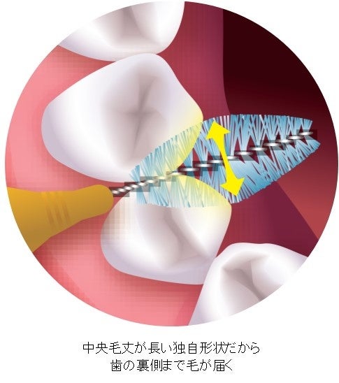 ①当社既存製品※4同一サイズの中央毛丈と比べて1.5倍長い独自形状。広い歯間部や歯の裏側まで毛が密着し歯周プラークをかき出します。