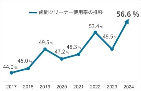 昨今のオーラルケア意識の高まりを背景に、歯間ブラシやデンタルフロスなどの歯間クリーナーの使用率は2017年の44%から2024年には56%へと、10ポイント以上伸長しています※2。