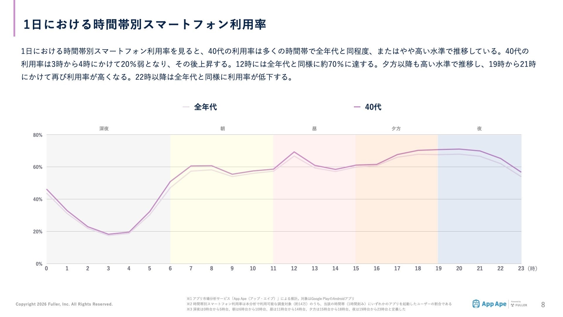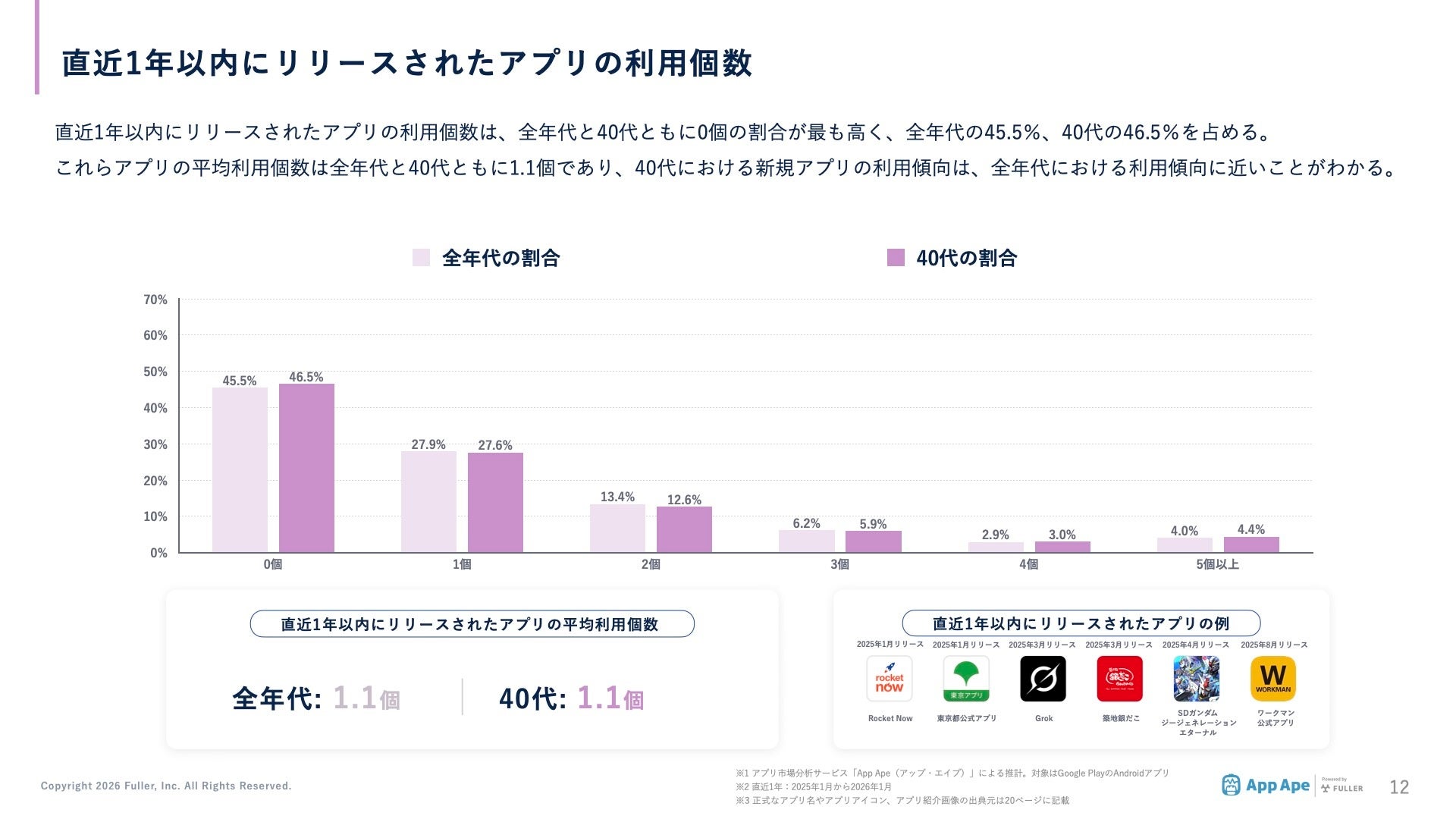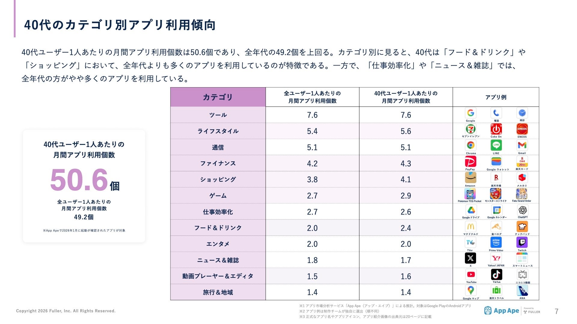フラー株式会社(本社:新潟県新潟市、代表取締役社長:山﨑将司、以下「フラー」)は、アプリ市場分析サービス「App Ape(アップ・エイプ)」に蓄積するデータから、40代(40〜49歳)のスマートフォン利用実態をまとめた「年代別アプリ利用動向レポート2026 40代編」を公開しました。