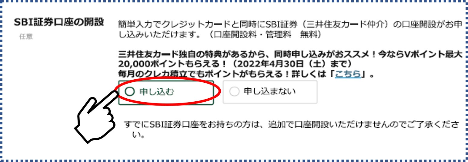 <三井住友カード申込時の、SBI証券口座の開設希望チェック欄イメージ>