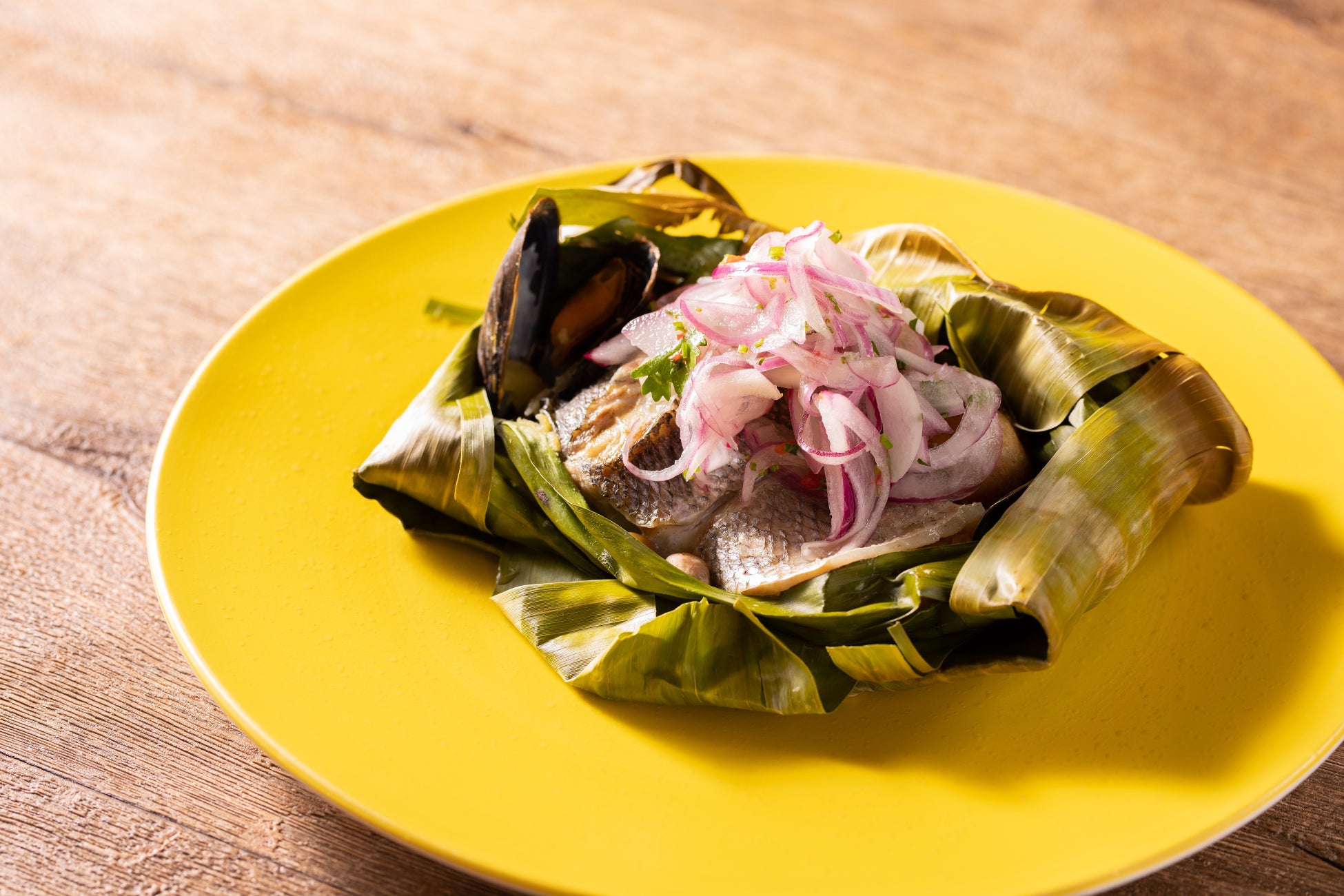 ▽玄界灘産 秋の紅葉鯛と三浦野菜のバナナの葉包み焼き「パタラシュカ」