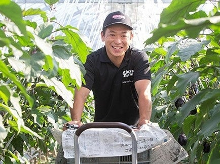 宮崎県の伝統野菜「佐土原ナス」。佐土原ナスは、一般的な千両ナスに比べてかなりサイズが大きく、柔らかでとろけるような食感が特徴です。夏に比べて秋はゆっくり成長するため、皮のキメが細かく、より濃厚で甘みのある果肉が育ちます。生で食べると梨のような風味を感じる、灰汁を感じさせないナスです。