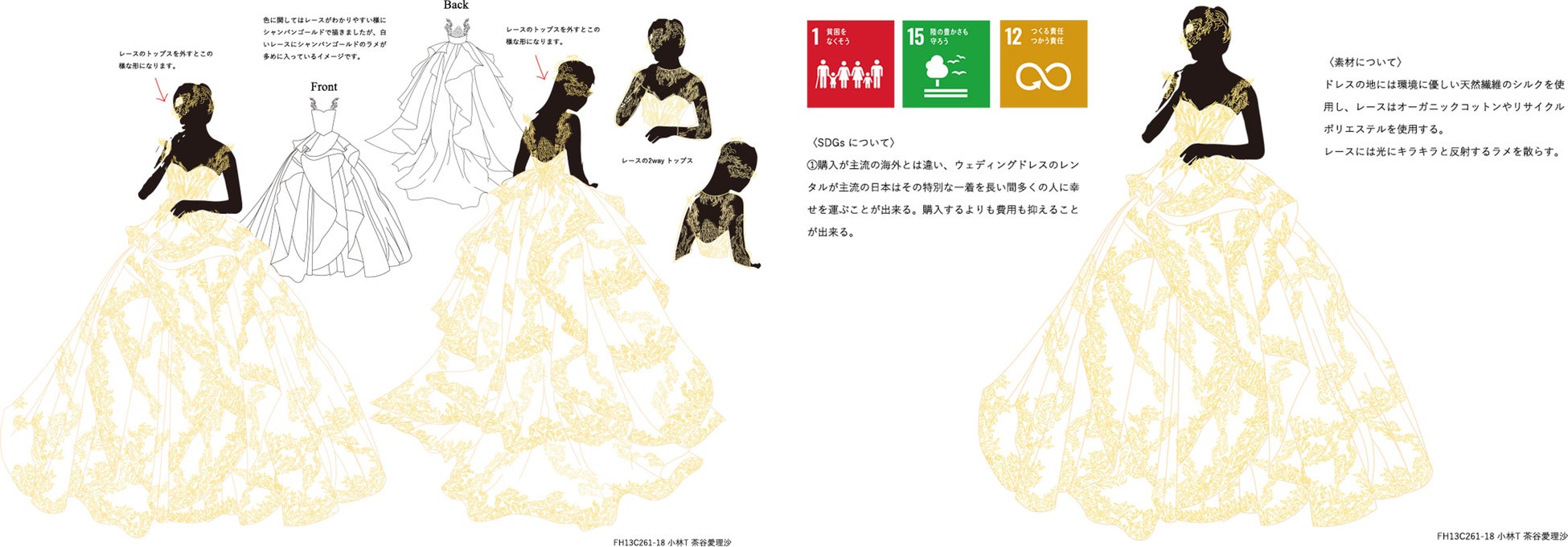 また、より多くの人の心に響くドレスを目指し、着脱可能なレースのトップスもデザインしました。今回の産学連携を通して初めてのドレスのデザインに挑戦することができ、大変勉強になりました。SDGsの取り組みについても考えることで、より良いウェディングドレスがデザインできたと思います。