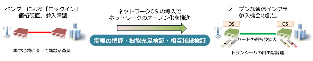 この課題を解決するためには、ネットワークのオープン化(※)を実現するネットワークOSの導入を推進することにより、ハードウェアと光トランシーバのマルチベンダー化を促進し、自由にハードウェア・OS・トランシーバを組み合わせて使うことができる環境を構築し、ベンダーロックインを解消することでサプライチェーンを多様化し、参入が容易なオープンエコシステムを形成していくことが必要となります。
