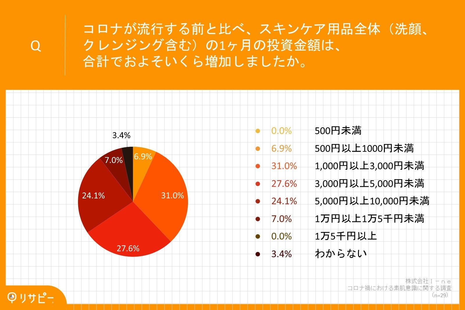「コロナが流行する前と比べ、スキンケア用品全体(洗顔、クレンジング含む)の1ヶ月の投資金額は、合計でおよそいくら増加しましたか。」(n=29)と質問したところ、「1,000円以上3,000円未満」が31.0%、「3,000円以上5,000円未満」が27.6%、「5,000円以上10,000円未満」が24.1%という回答となりました。