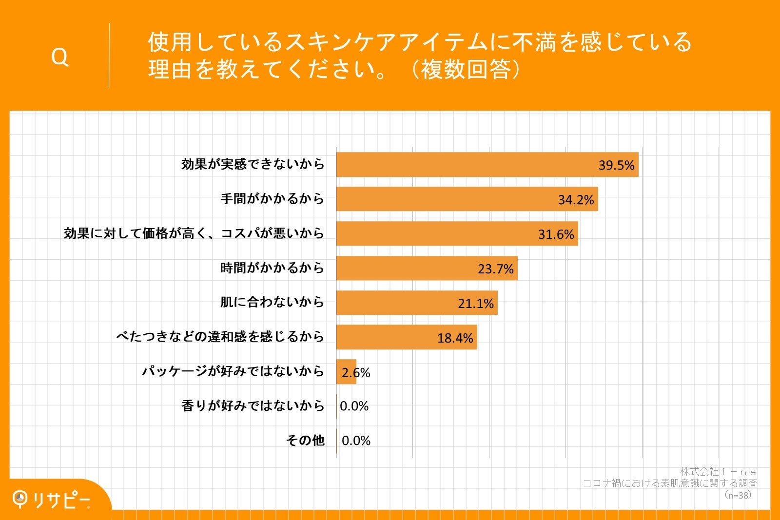 また、「使用しているアイテムに不満を感じる理由を教えてください。(複数回答)」(n=38)という問いには、「効果が実感できないから」が39.5%、「手間がかかるから」が34.2%、「効果に対して価格が高く、コスパが悪いから」が31.6%と効果に対する満足度が低いことが大きな要因であることがわかりました。