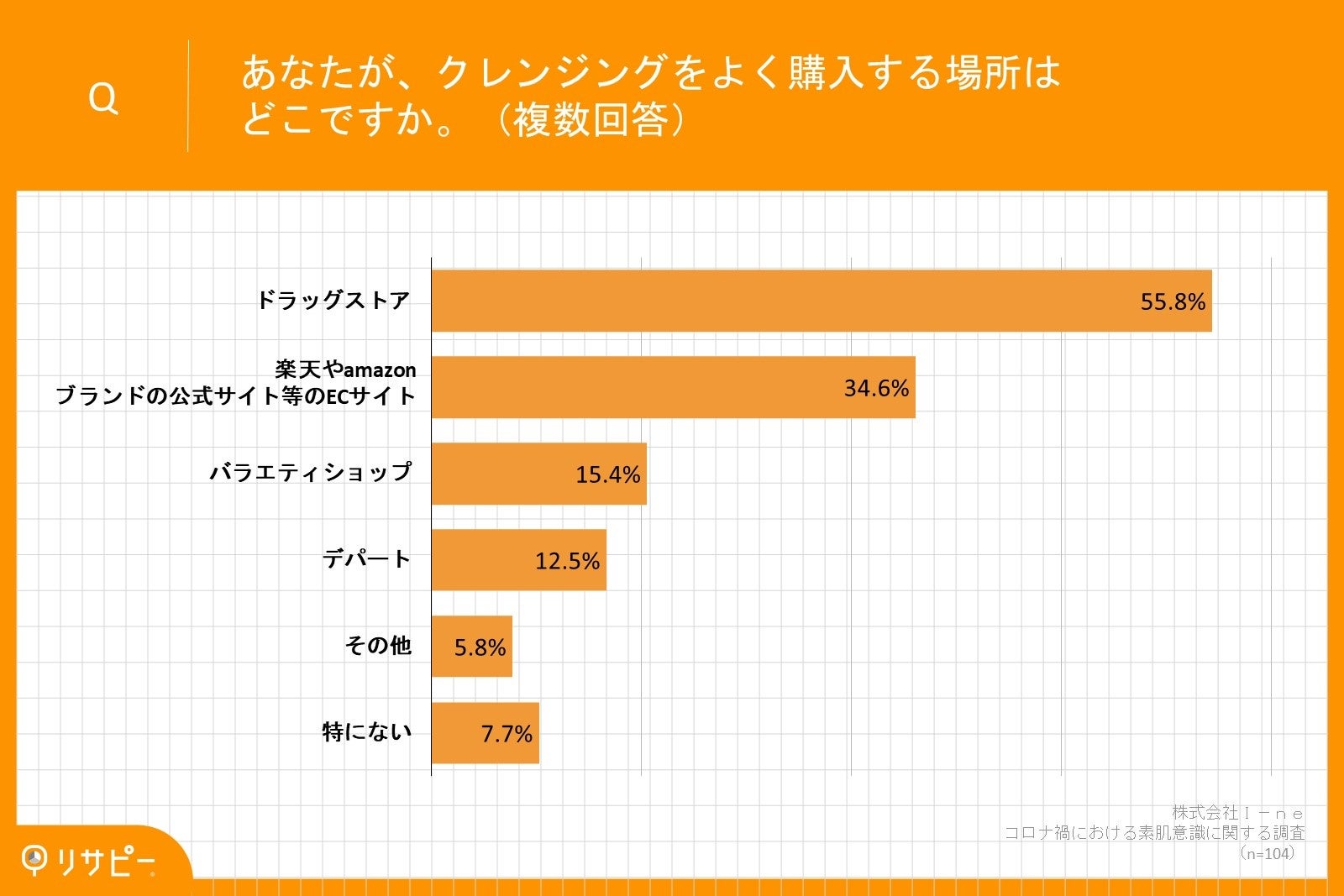 「あなたが、クレンジングをよく購入する場所はどこですか。(複数回答)」(n=104)と質問したところ、55.8%が「ドラッグストア」、34.6%が「楽天やamazon、ブランドの公式サイト等のECサイト」、15.4%が「バラエティショップ」と回答。身近でリーズナブルな価格帯の商品が並ぶドラッグストアが、クレンジングを購入する場所としては選ばれる傾向が高いことがわかりました。