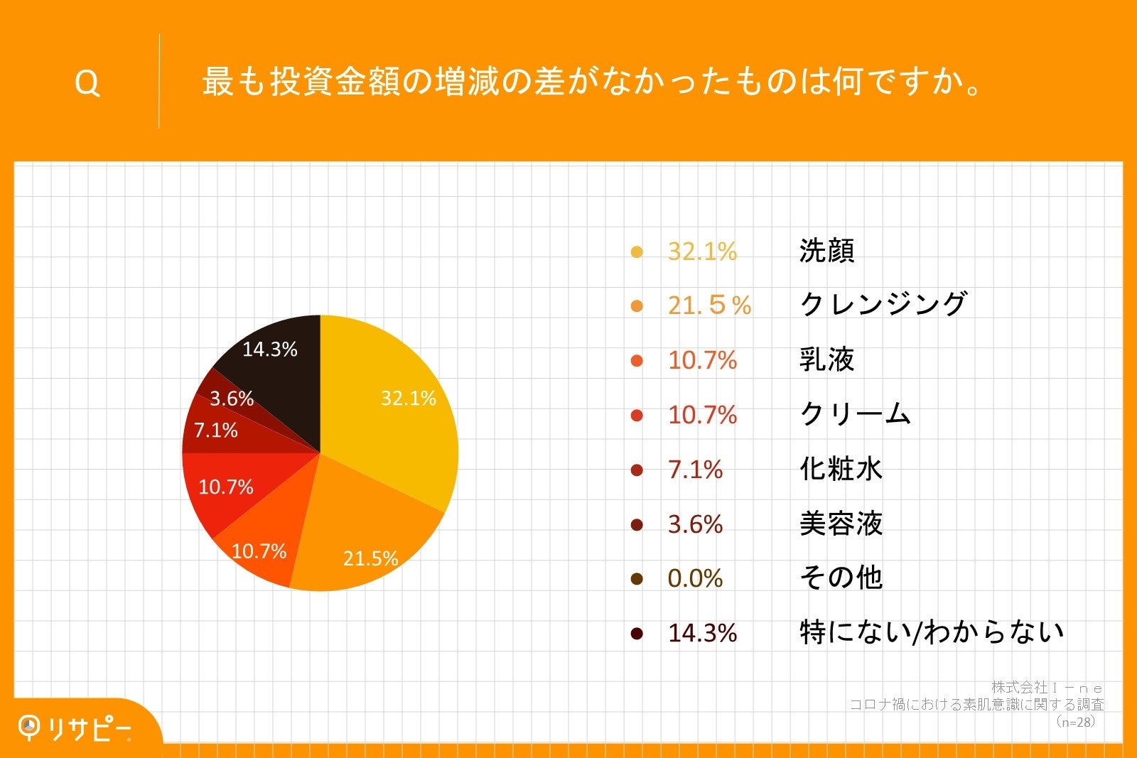 「最も投資金額の増減の差がなかったものは何ですか。」(n=28)と質問したところ、「洗顔」が32.1%、「クレンジング」が21.5%、「クリーム」が10.7%という回答となり、「化粧水」や「美容液」と比べて優先度が低いことがわかりました。