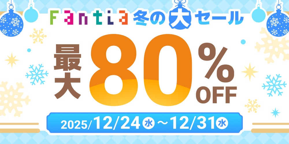 毎年ご好評をいただいております「Fantia 冬の大セール」は、クリエイターの皆様の出品商品が最大80%OFFでご購入できるFantia最大級の大型セールです。クリスマスから年末にかけて、日頃ご支援いただいているユーザー様に、ご自身へのご褒美として購入いただきたく、今年は2025年12月24日(水)13時から12月31日(水)23時59分までの8日間にわたって開催します。