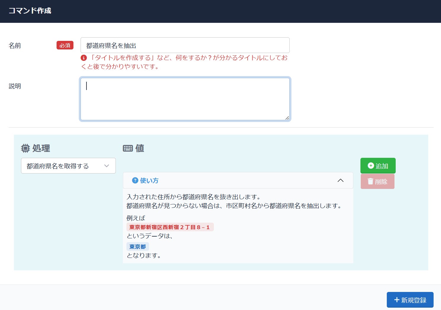 CSVやフィードのルール作成時に利用可能なコマンドに都道府県名を取得する機能を追加いたしました。この機能を利用することで1つのセル内に例えば「東京都豊島区千早1-15-17」と入力されていても「東京都」のみを抽出することが可能になりルール作成をスムーズに行えるようになりました。