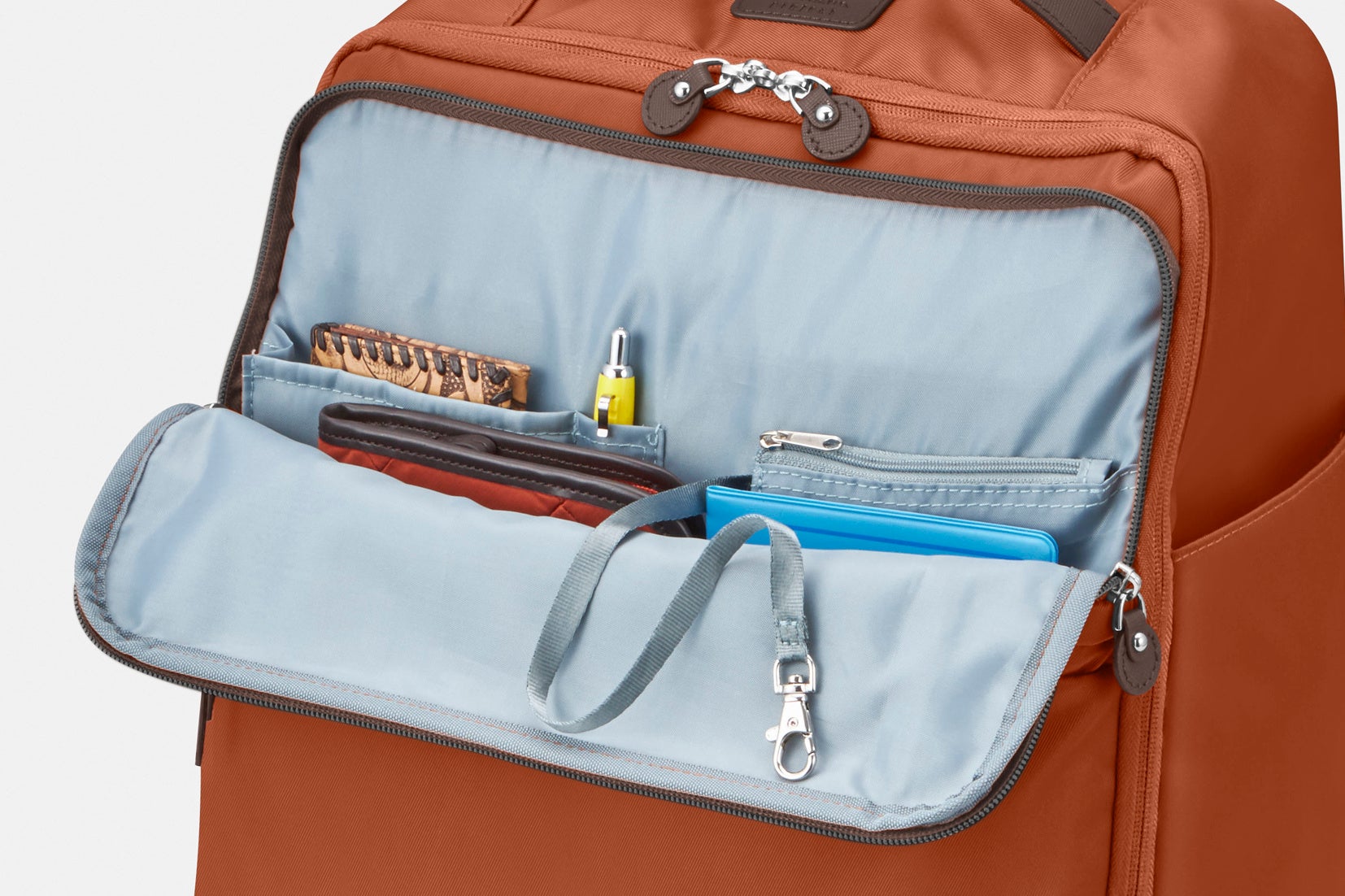 薄暗い場所でも中身が見やすいよう、明るいサックスカラーの内装生地を採用しました。