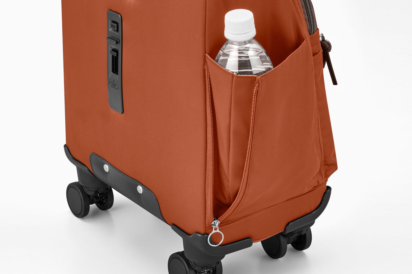 階段などでトローリーバッグを持ち上げる際に便利なハンドル。サッと手に取りやすく、しっかり握れます。