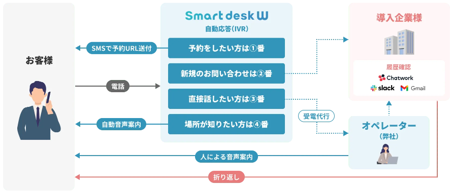 「Smart desk W」は、会社や事務所にかかってくる電話を自動音声応答(IVR)と受電代行を組み合わせて、代行するサービスです。IVRを使用して一次仕訳をおこない、人間の応対が必要な受電のみをオペレーターにつないだり、重要な内容のみ転送することが可能です。