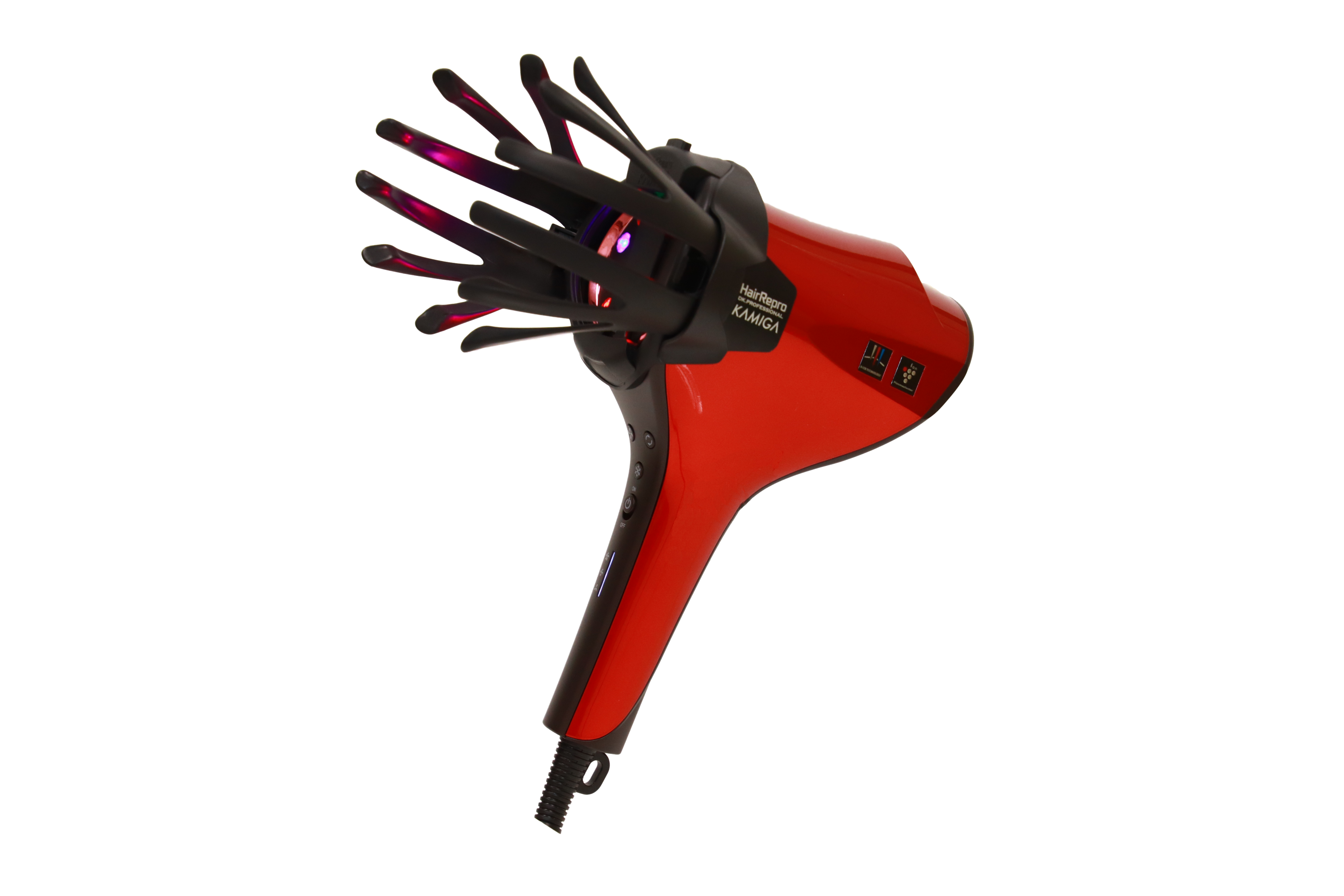 2つの吹出口から髪の広範囲に風を届ける速乾方式や、熱ダメージや過乾燥を抑える温度に自動調節する「センシングドライモード」などのシャープ独自技術に加え、LED光源「N-LEDbeam®」(エヌ エルイーディービーム)と、付け替え可能なアデランスオリジナルのかっさアタッチメント「カミガハンド」「カミガかっさ」を搭載したドライヤー。髪を乾かす機能に加え、ご自宅でスカルプエステが楽しめる「KAMIGAモード」が搭載されている点が最大の特徴。また、速乾方式の採用により、アデランス従来機(N-LED Sonic)と比べ、ドライ時間を約50%短縮※1。さらに、プラズマクラスターイオン※2により静電気を約96%※3低減する。「かっさアタッチメント」で髪をかき分けながら、プラズマクラスターイオンと「N-LED beam®」の赤色LEDと青色LEDを髪と頭皮にたっぷり届ける。