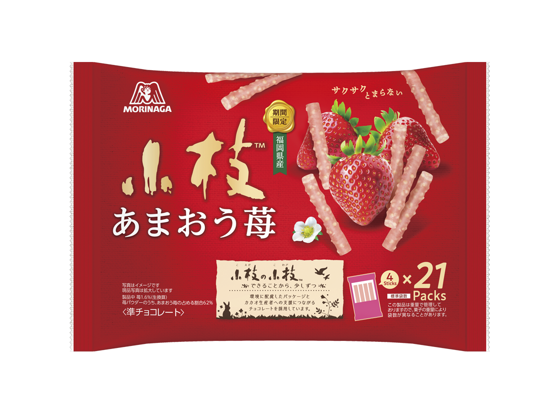 苺フレーバー菓子は毎年期間限定で発売しており、安定した人気でご好評をいただいています。今年は、苺の王様と言われる「あまおう苺」を使用した「小枝」「キャラメル」やケーキ、甘酸っぱくフレッシュな苺味のふわもち食感マシュマロをチョコレートでつつんだ「エンゼルパイ」など、様々な苺のお菓子を取り揃えました。苺の旬に一足早く、様々な苺のお菓子を取り揃え季節の味わいを提供することで、お客様に笑顔をお届けしてまいります。