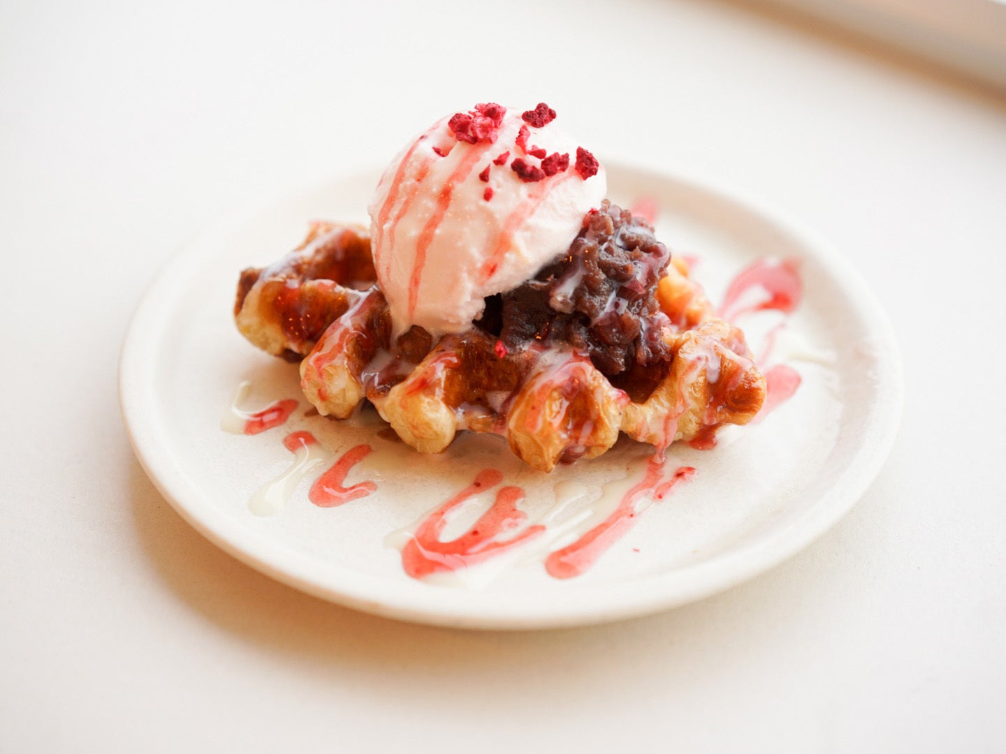 クロワッサン生地で作る新感覚のスイーツ「クロッフル」。サクラアイスを贅沢に使用し、あずきとの和の組み合わせは抜群です。春を感じられる期間限定クロッフルとなっております。
