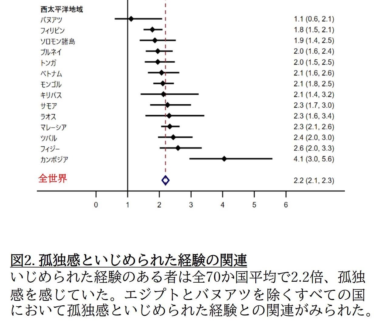全体としては、女子(vs 男子 有病オッズ比=1.4 95%信頼区間:1.3–1.4)、いじめられた経験あり(有病オッズ比=2.2, 95%信頼区間:2.1–2.3)、親友がいない(有病オッズ比=1.8, 95%信頼区間:1.7–1.9)生徒において孤独感が高く、特にいじめられた経験と孤独感の関連はほぼ全ての参加国で認められました(図2)。