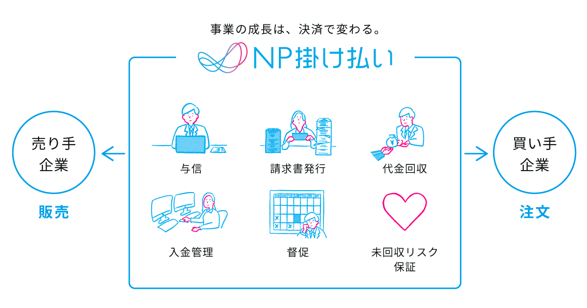 「NP掛け払い」は、企業間取引(BtoB)向けの後払い決済サービスです。当社が売り手企業と買い手企業の間に入り、買い手企業への与信から請求書発行、代金回収までの決済・請求業務全てを請け負います。NP掛け払いの導入により、売り手は決済・請求業務をまるごとDX化し、本来業務により集中できます。また未回収リスクの保証もするため、経営基盤の安定化を図れます。さらには、従来の信用機関に依存しない独自の与信審査によって、個人事業主を含む事業者に対して与信通過率99%(※1)と柔軟に掛け売りを提供することができ、販路拡大・売上向上が見込めます。買い手は掛け払いを利用することで、キャッシュフローの改善を期待できます。