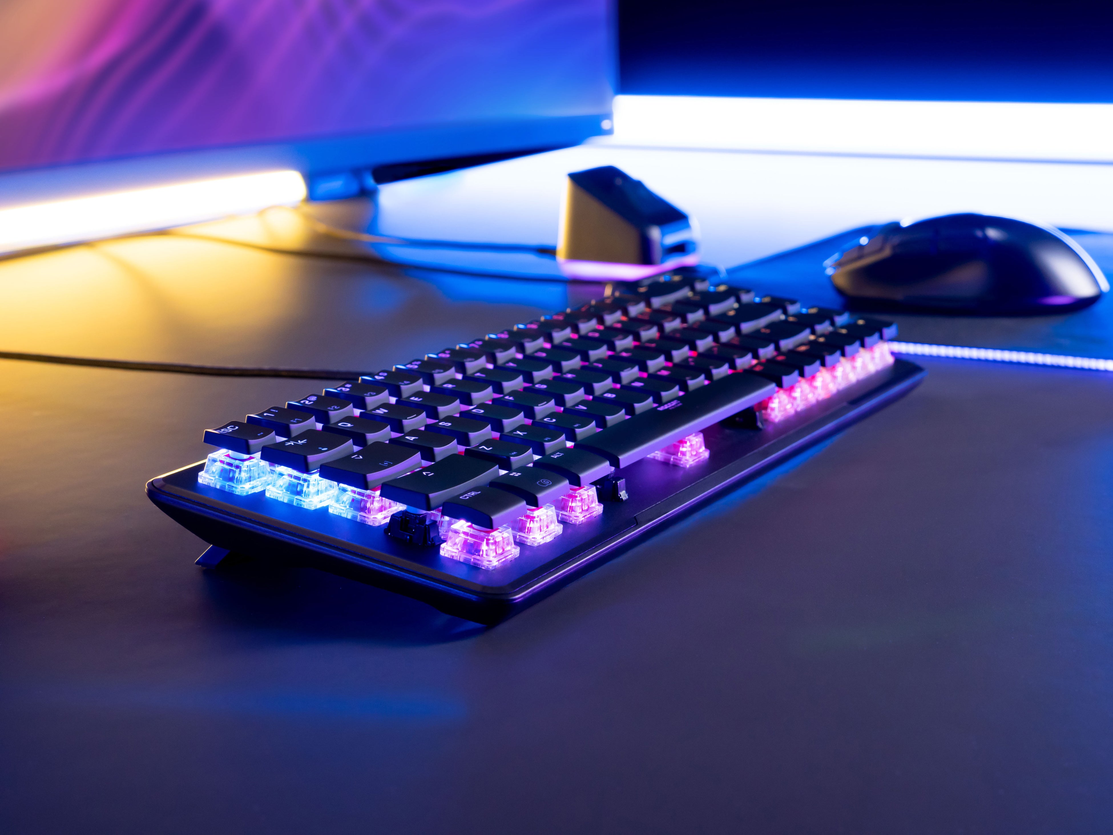 「Vulcan II Mini」は、高い耐久性と多彩な性能が小さなフォームファクターに集約された、光学式メカニカルゲーミングキーボードです。矢印キーを残しつつ、標準的なキーボードの65%のサイズに設計されているため、スピード感のあるゲームで想定されるマウスの動きにも、十分なスペースを確保することができます。光学式スイッチは超高速で作動し、キーストローク1億回という驚異的な耐久力を誇ります。