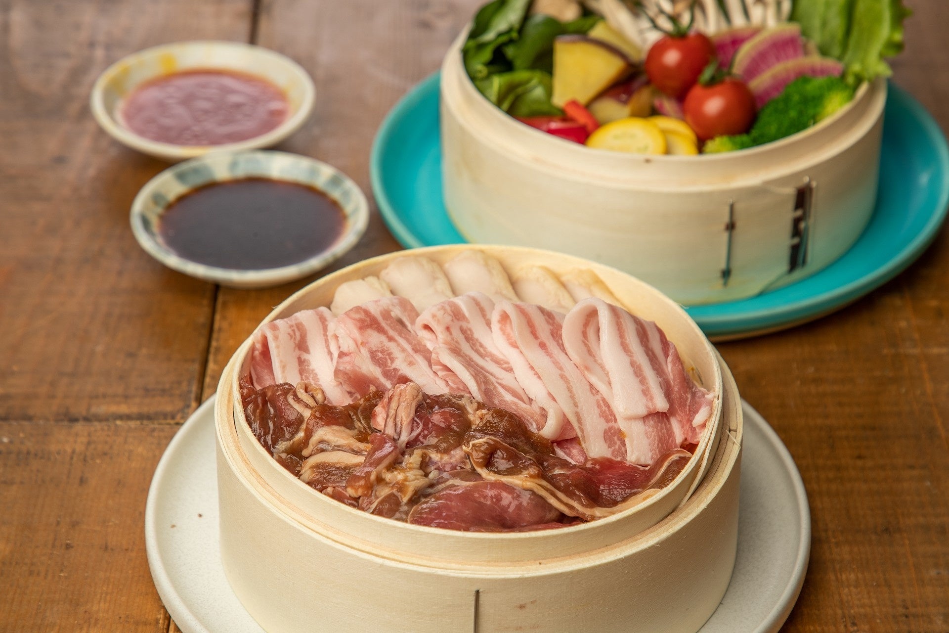 ■ せいろ ラム肉&国産豚バラ肉&エスニック蒸し鶏盛り合わせ(食べ放題)