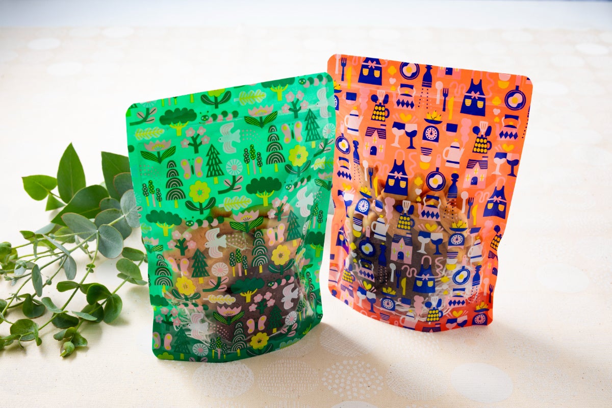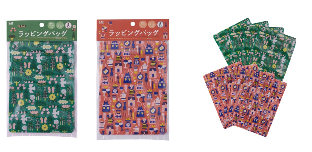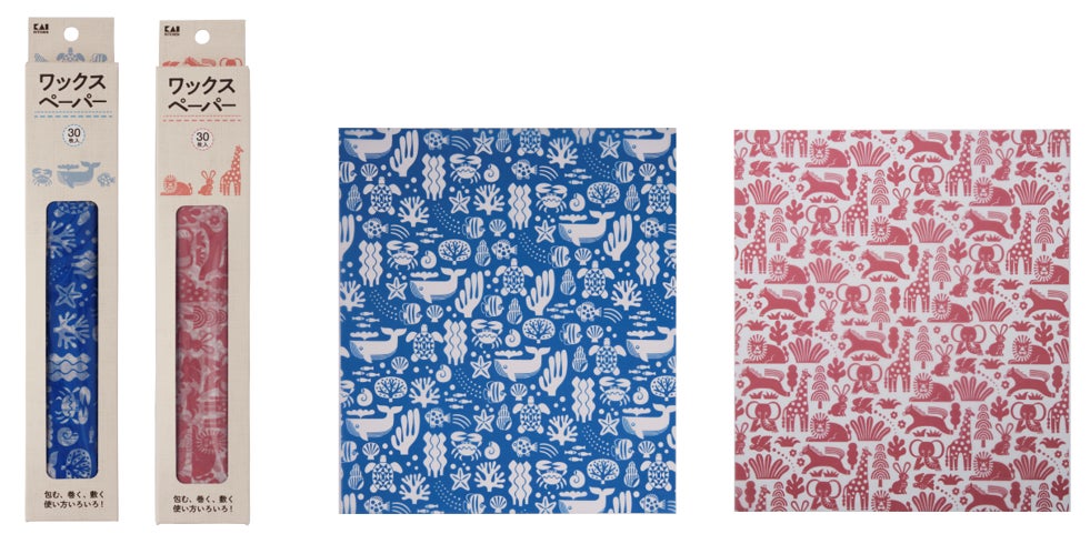 また、ラッピングには2種類あり、小分けのプレゼントにぴったりな、ラッピングバッグと1枚はさむだけで華やかなワックスペーパーが登場。ワックスペーパーは、くじらやヒトデなどを、ブルーと白で描いた「マリン」柄と赤と白でゾウやキリンを描いた「アニマル」柄の2種類があります。ラッピングバッグはキッチン柄のほかに緑地に花の模様の「ナチュラル」柄があります。