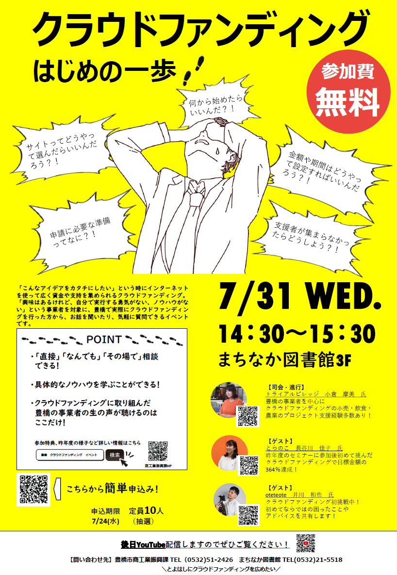 豊橋市ではそんな事業者の方に向けて、豊橋で実際にクラウドファンディングを行った経験者に「直接・なんでも・その場」で気軽に相談することができ、具体的なノウハウを学べる昨年よりもパワーアップしたトークイベントを今年も開催します!