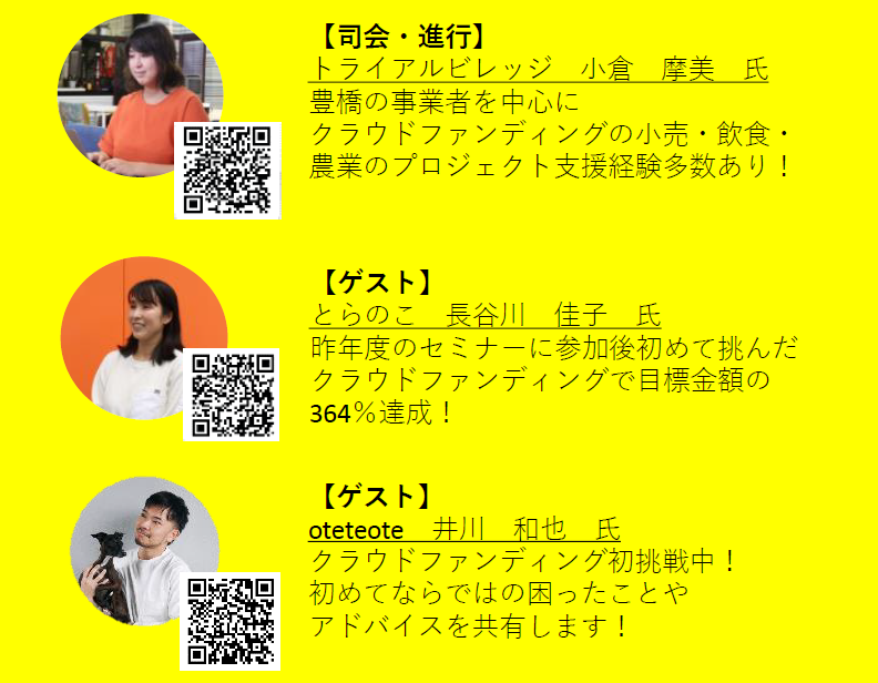 今回は昨年度の受講者がゲストとして参加。昨年のイベント時に始め方を学んだ後、実際にクラウドファンディングに挑戦した際の経験談などをお話しします。