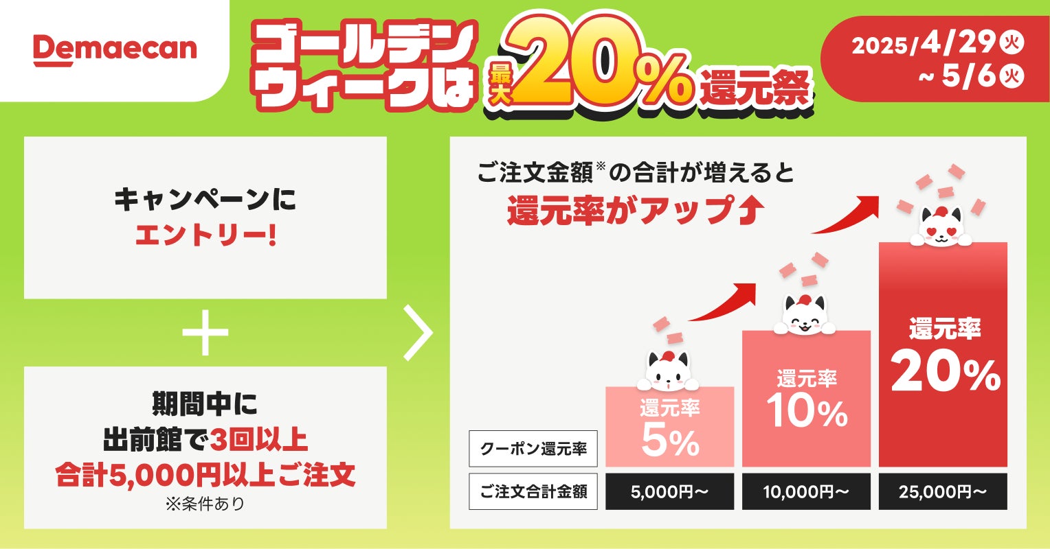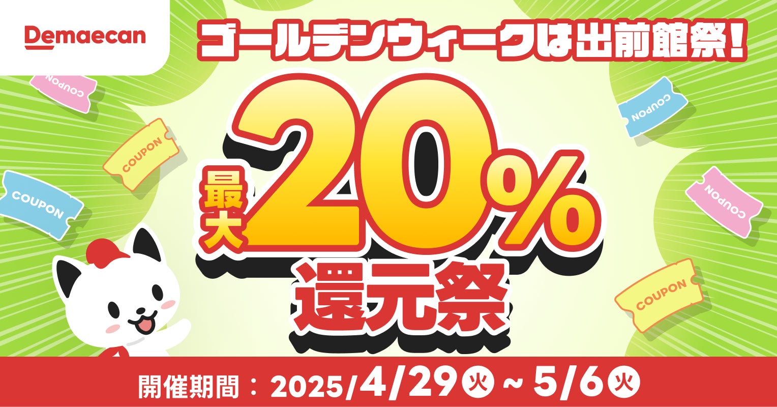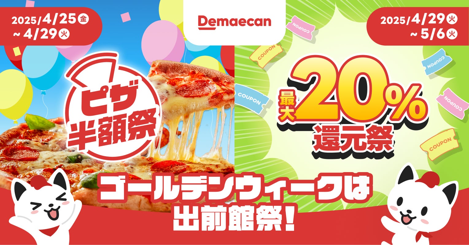 株式会社出前館は、運営する日本最大級のデリバリーサービス「出前館」において、最長11連休となる2025年のゴールデンウィーク期間中に、出前館をおトクに楽しめる2つの祭「ピザ半額祭(2025年4月25〜4月29日)」と「最大20%還元祭(2025年4月29〜5月6日)」を開催いたします。