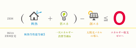 IKIでは、このようなZEH住宅への追い風を平屋住宅を求める層へとお届けすべく、ZEH住宅を標準仕様としました。一定の外皮性能(断熱等性能等級5)、一定以上の省エネ性能(一次エネルギー消費量等級6)、そして創エネ(太陽光パネル)導入に対応することによってエネルギー消費量を実質ゼロにします。このようにIKIのZEH住宅は高い性能と創エネ機能を備えながらも、坪40万円台~というローコストでの提供を可能にし、低価格で高品質を実現しました。