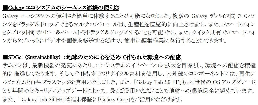 サムスンのコスパ機「FEシリーズ」が日本初登場!パワフルなパフォーマンス・カメラ・オーディオ・耐久性・コスパを兼ね備えた一台「Galaxy Tab S9 FE」2023年10月19日(木) 本日発売
