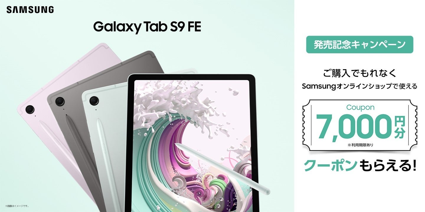 対象期間中に対象販路にて、「Galaxy Tab S9 FE」をご購入いただいたお客様全員にSamsungオンラインショップクーポン7,000円分をプレゼントいたします。