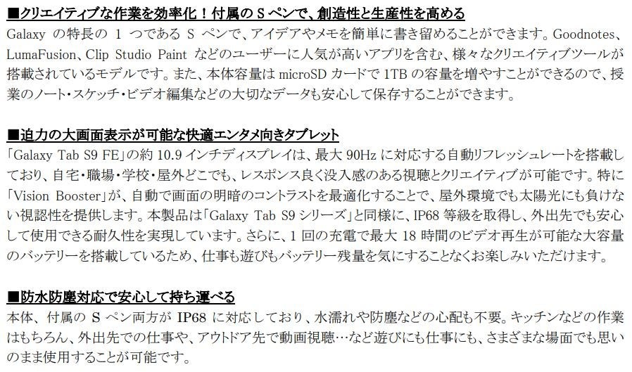 「Galaxy Tab S9 FE」の特長は、以下のとおりです。