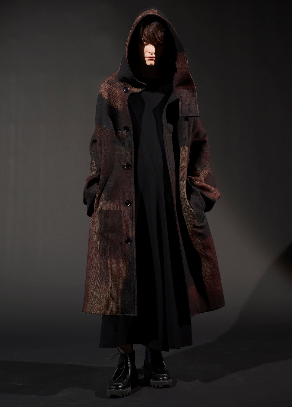 肉厚なへリンボン生地のフード付きコート。ヴィンテージのスカーフ柄や古着の生地を柄として取り入れ、パッチワークのようにプリントで表現された。肩に接ぎのないフォルムと後ろに下がるフードがつくるユニークなシルエット。フードを縁取るようについた襟は、フロントでボタンを留めるとスタンドカラーのようなスタイルに。