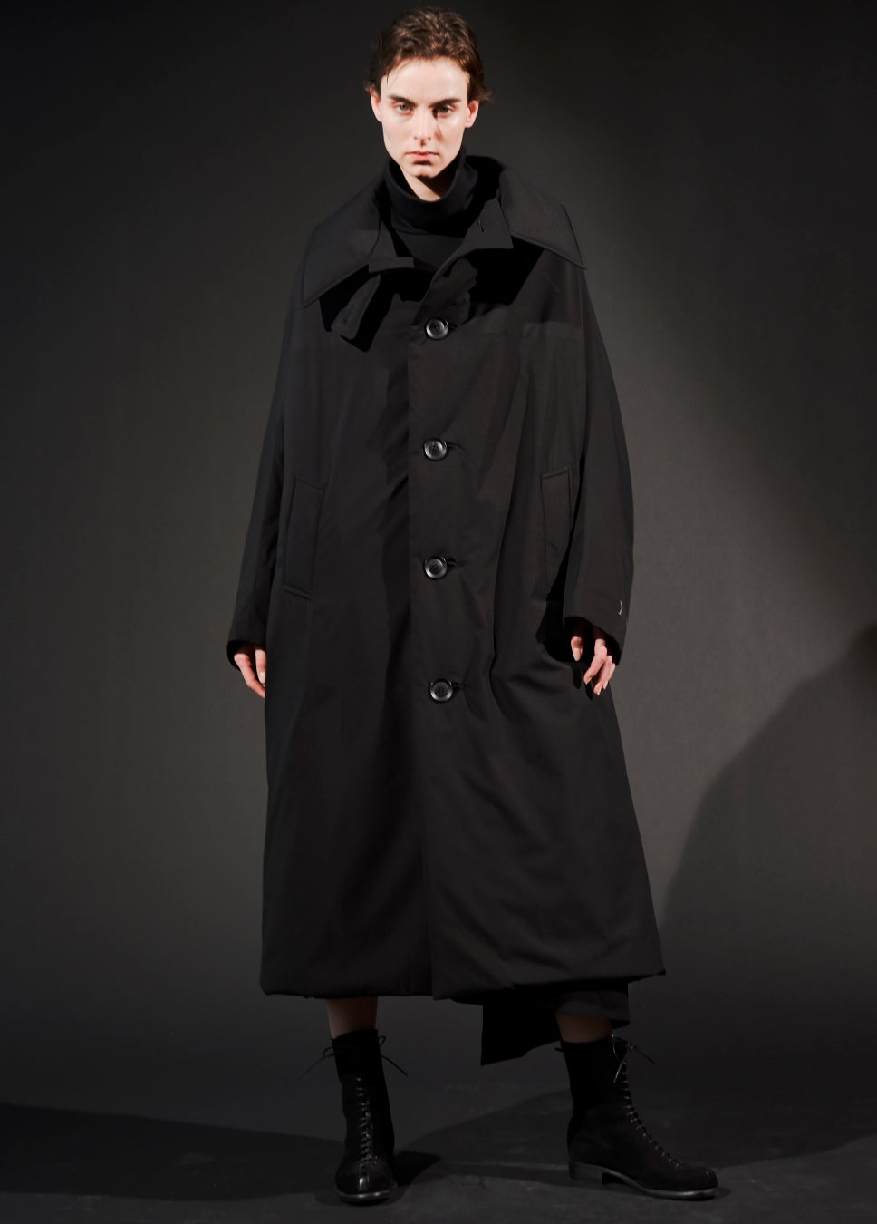 Y'sのアイコニックなロングケープコート。天然素材のようなマットなルックスとふくらみを再現したタイプライターポリエステル。中綿にシンサレートが使われ、ごく軽く暖かで、シワになりにくい、日常的で気軽なコート。
