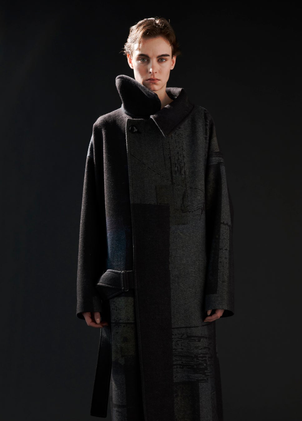 パターンメイキングで陰影が加えられドラマティックにシルエットを描く、あるいは、紳士服のような無骨なシルエットが遊びあるプリント柄で柔らかな印象をつくる。ざっくりした粗野な印象、ふっくらとしたウールの質感はふくよかで、要素のバランスがワイズらしいコートをつくる。