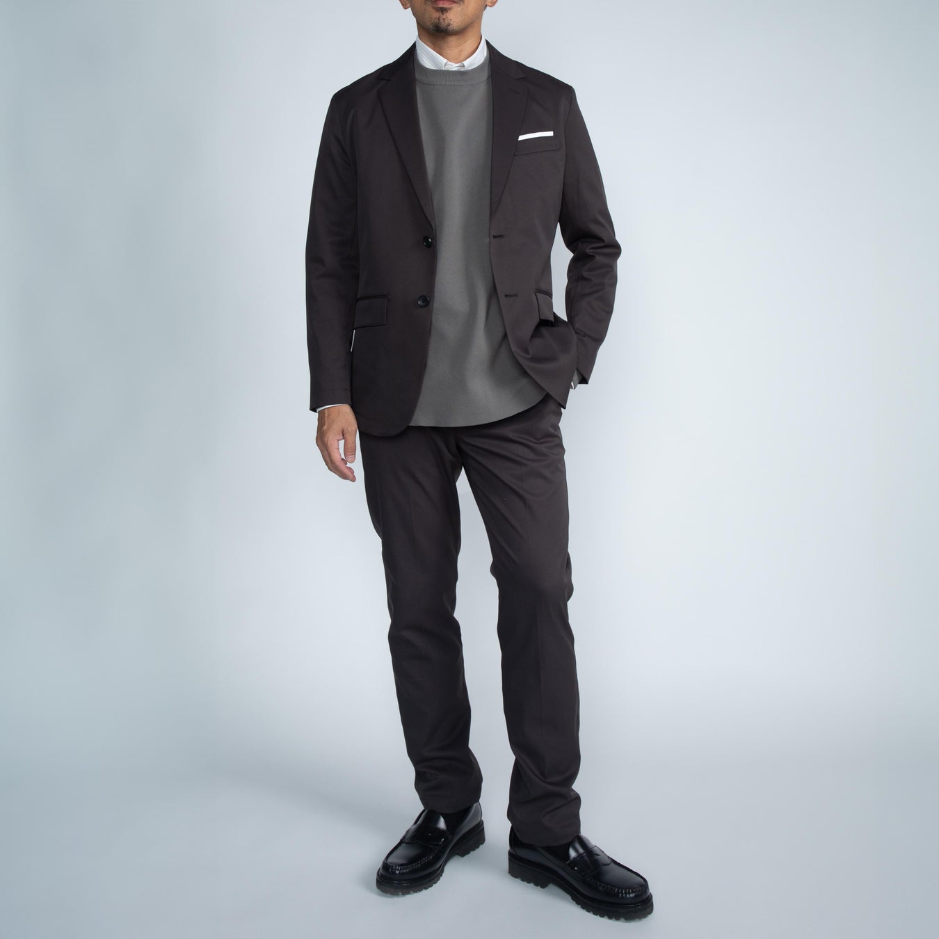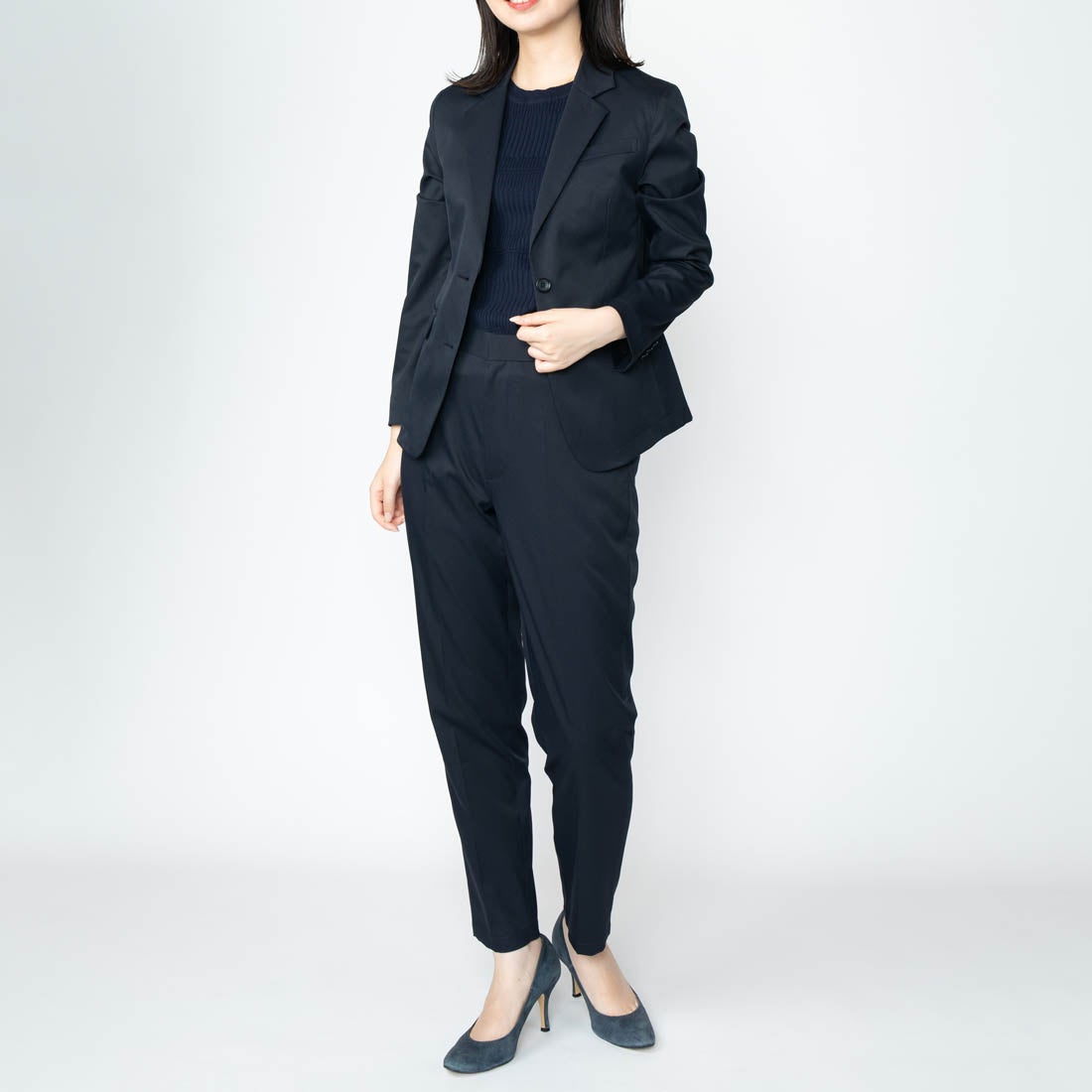 特徴:生地はストレッチ性、速乾・撥水、水洗い可、イージーケアなどの高機能性を備える自社オリジナル素材「ultimex」を使用。身体から発生する遠赤外線を吸収して蓄熱する特殊な素材を裏地に使用し、保温性を高めました。さらに、裏地も伸縮性が高く軽量なので、着心地の快適さは損なわれません。冬場の静電気を軽減するため、袖口や裾などに放電テープを縫い込みました。メンズのジャケットには、胸ポケットに出し入れ可能なフェイクチーフを搭載。メンズ・レディースともに、左内ポケットにはファスナーがついており、スマホや名刺入れ、パスポートなどが収納可能。メンズのパンツのウエストは背面ゴムに、レディースのパンツのウエスト両サイドにゴムを内蔵することで、締め付け感なく長時間着用できます。メンズ・レディースともに、センタープレスを入れることで洗練された雰囲気を演出しました。