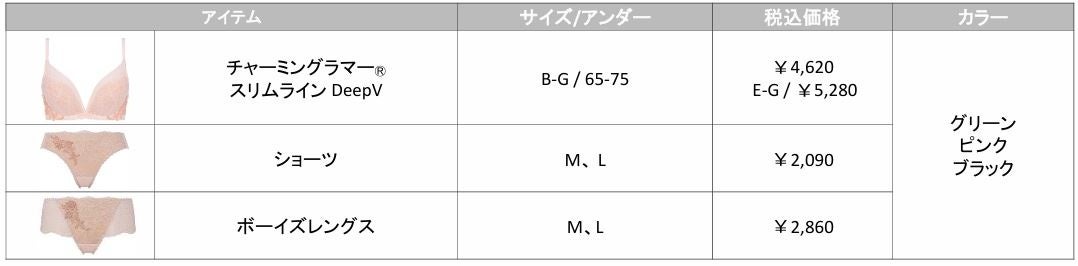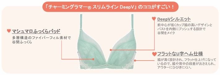 カップの上辺を折り返したチュールをふんわり重ねた、透けるデコルテや、クラシカルかつ繊細なレースが魅力的。レリーフのようなアップリケは、あえて端を縫い留めず、ひらりとした動きを出しました。 ブラジャーは、360°パーフェクトシルエット&くっきり谷間で人気の「チャーミングラマーⓇ スリムライン DeepV」をご用意しました。サイドもすっきりスリムで、秋のニットスタイルもきれいに着こなせます。