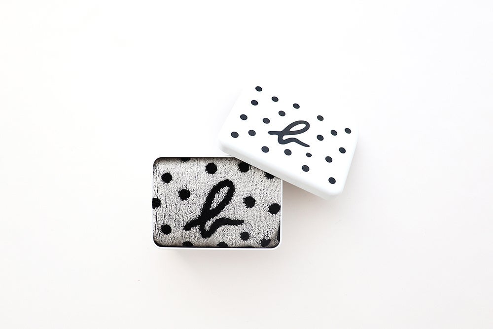水玉にb.ロゴがアクセントになった、シンプルで洗練された缶入りギフトです。化粧品やアクセサリー、文具などの小物整理に便利なサイズ感。セットされたタオルは流行に左右されない定番デザインです。