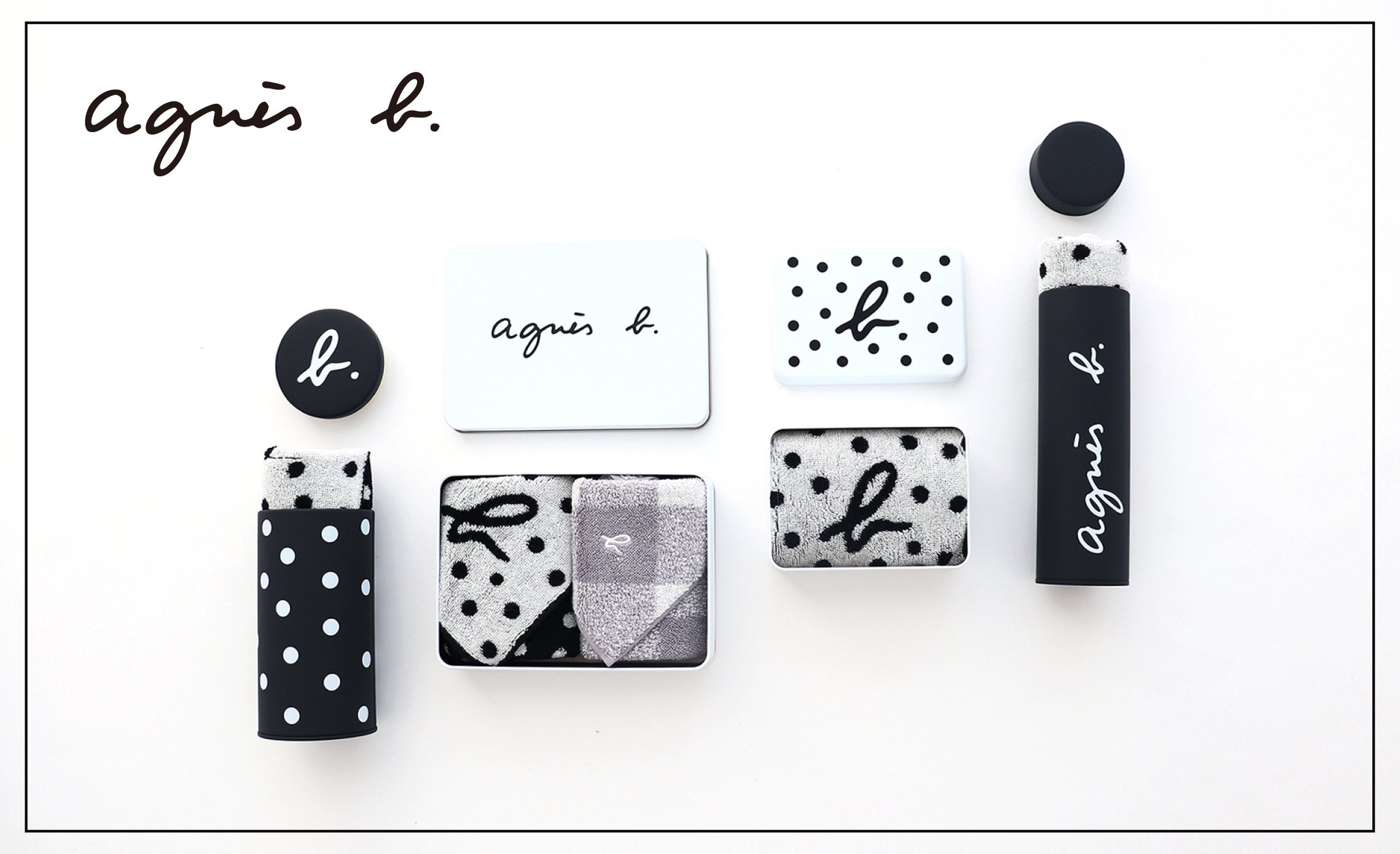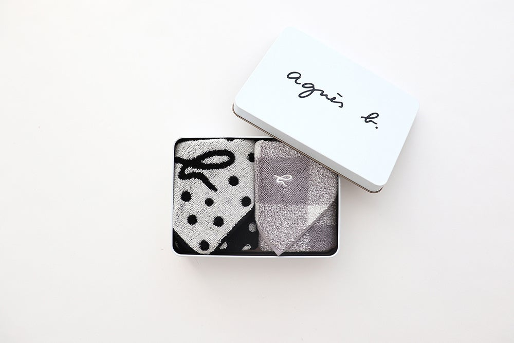 爽やかなホワイトベースにagnès b.ロゴが映える、上品な缶入りギフトです。文具や小物収納に便利なアフターユース可能なサイズで、水玉デザインと定番チェック柄のタオル2枚セット。