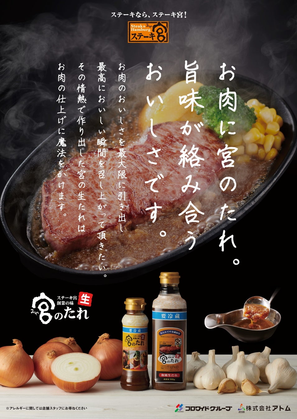 コロワイドグループの株式会社アトム(本社:神奈川県横浜市、代表取締役社長:田中公博)は、ステーキ宮3店舗(古河店・越戸店・宇都宮店)限定で、2024年9月10日(火)より、にんにく無し!「0(ゼロ)宮のたれ」を実施いたします。
