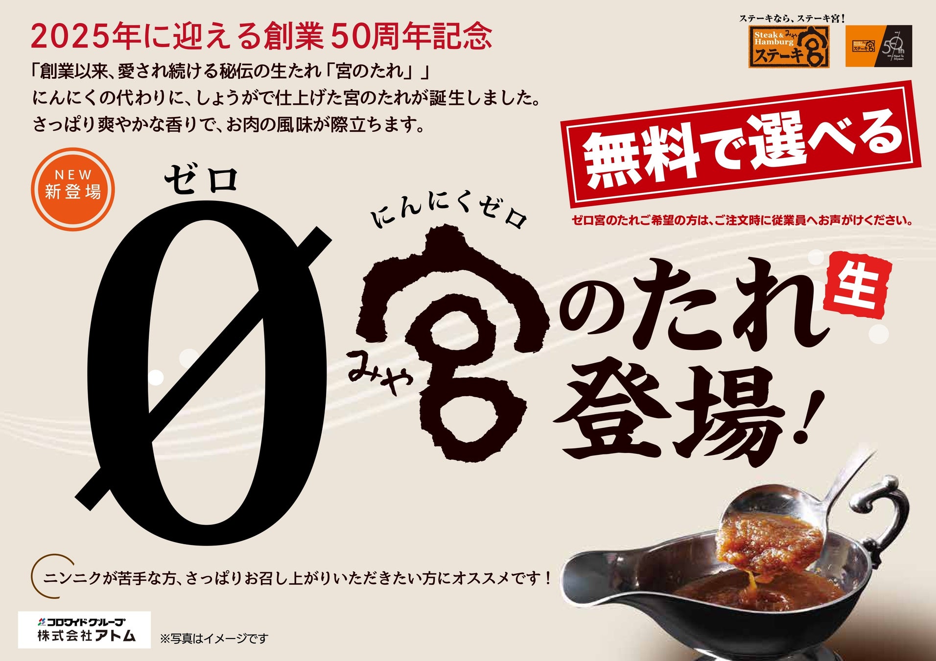 ステーキ宮といえば、宮のたれ!創業以来、愛され続ける秘伝の「生たれ」です。宮のたれに、にんにくは欠かせません。2025年に迎えるステーキ宮創業50周年を記念し、お客様のご要望にお応えして、あえてにんにくを使用せずに仕上げた“0(ゼロ)宮のたれ”が実現しました。