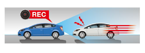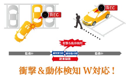 車両の衝撃だけでなく、フロントカメラのレンズ範囲内の動体の補足を検知すると検知前5秒、および検知後15秒間の映像を記録する「駐車監視録画」に対応。また車載電源ケーブル「CA-DR100」(別売)を使用することにより、最長24時間の監視が可能となります。